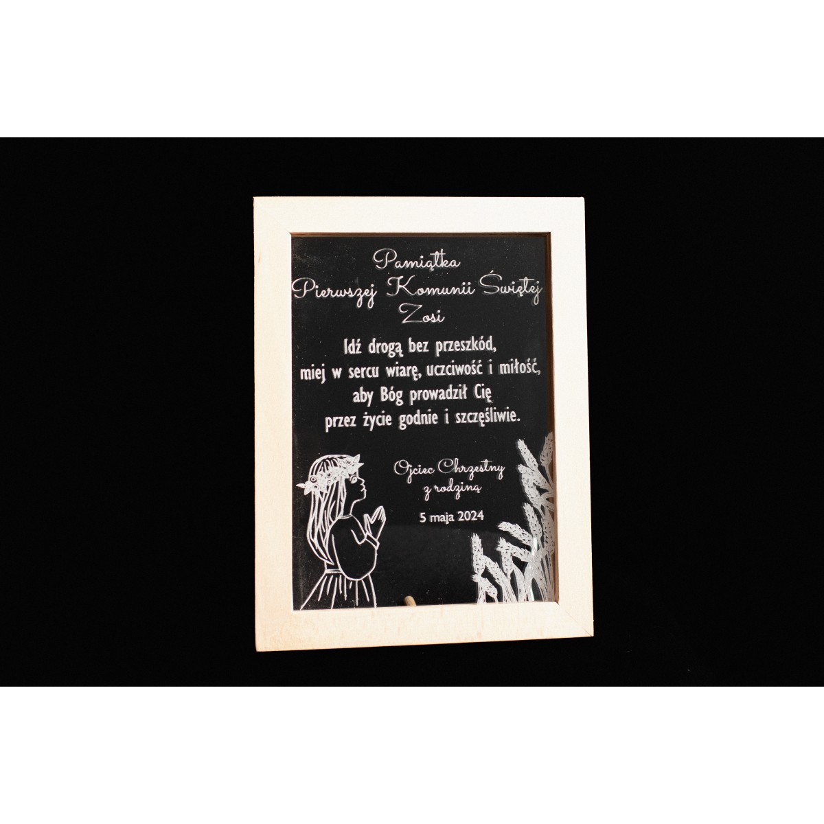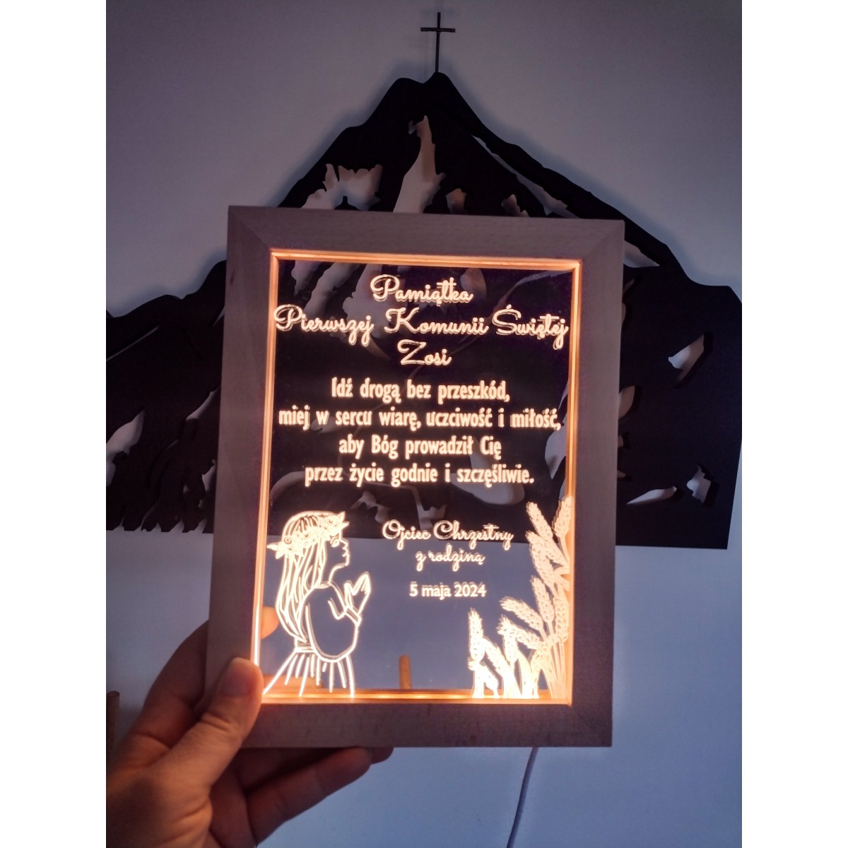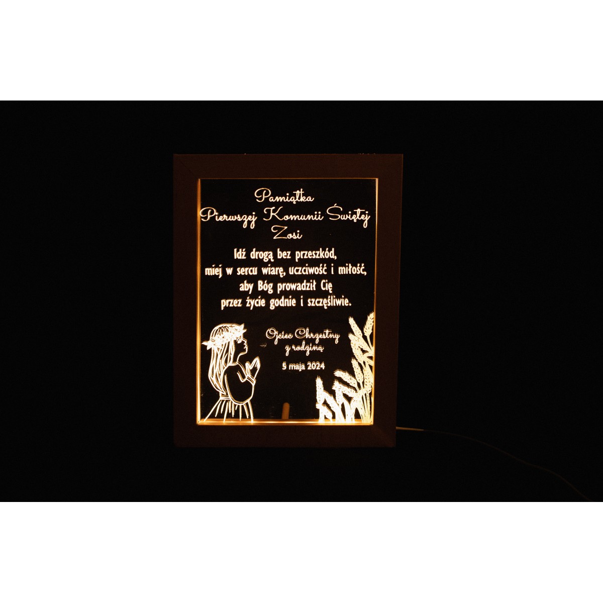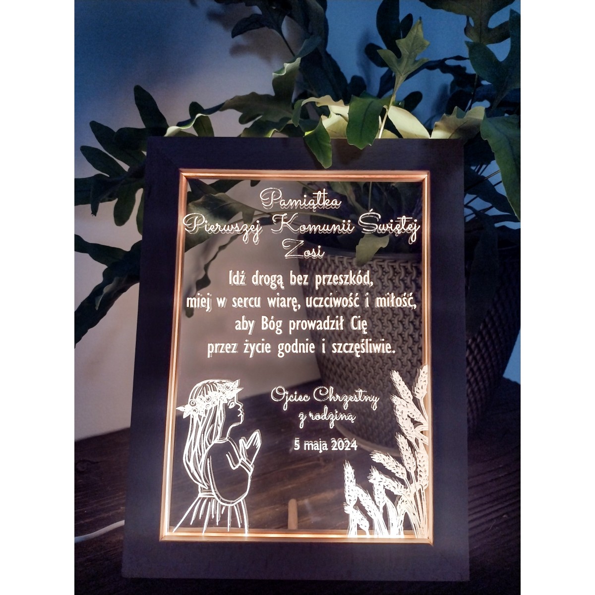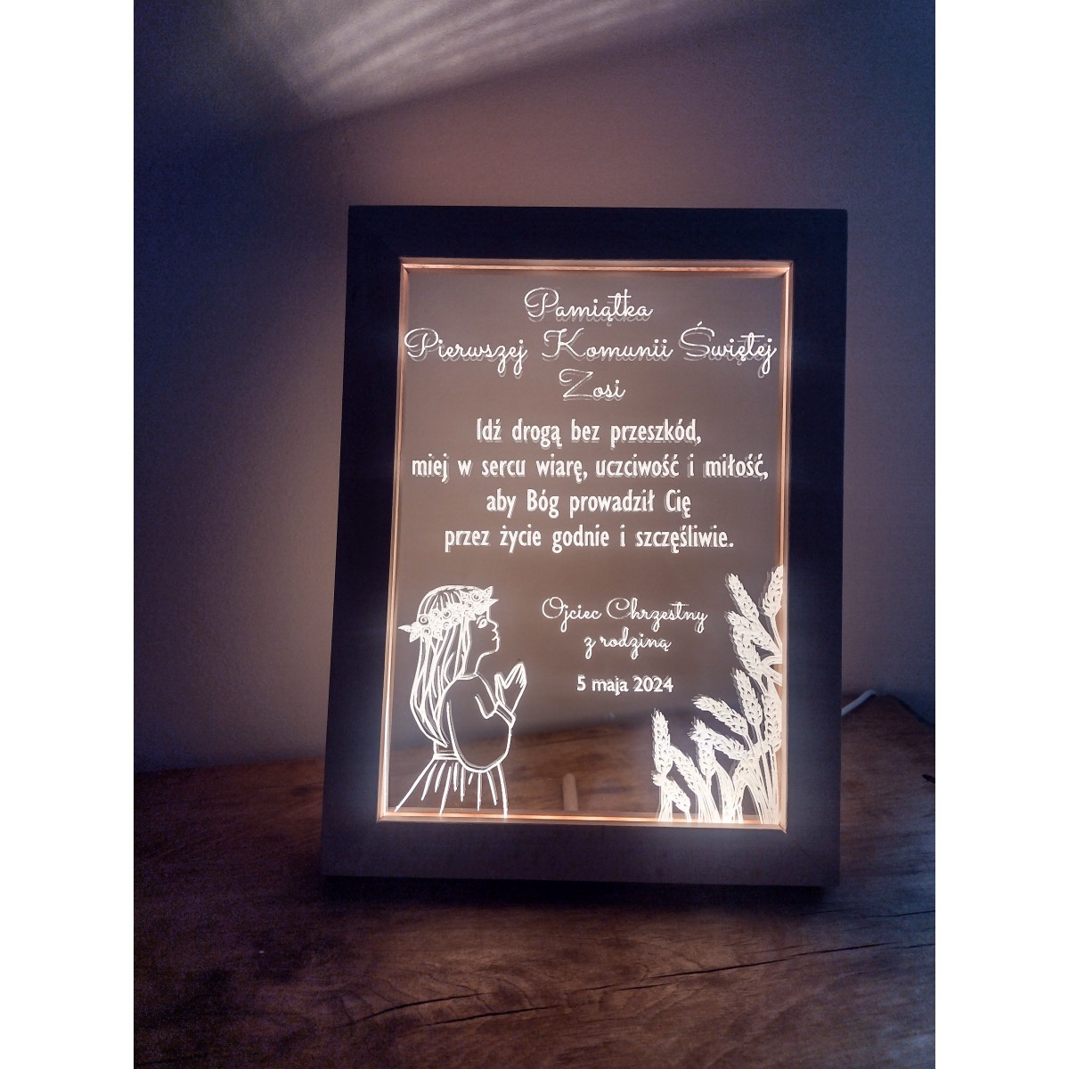 Świecąca ramka o formacie a5, pamiątka Pierwszej Komunii Świętej.