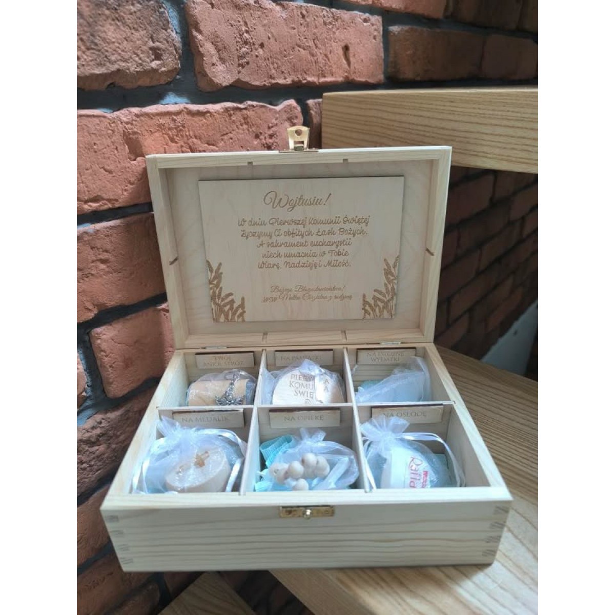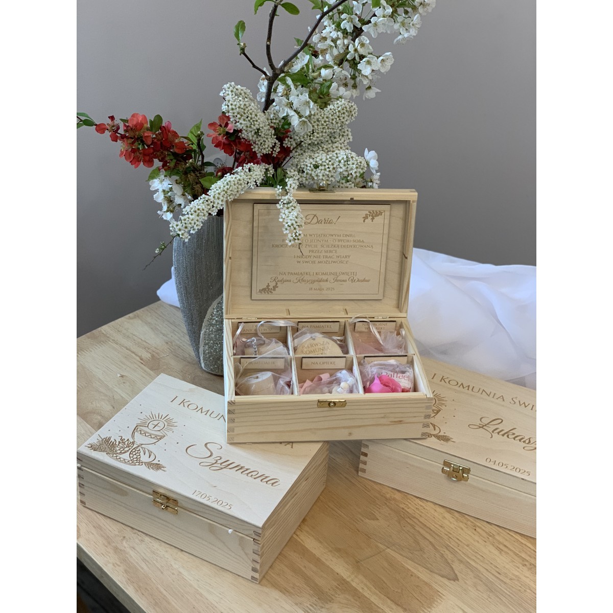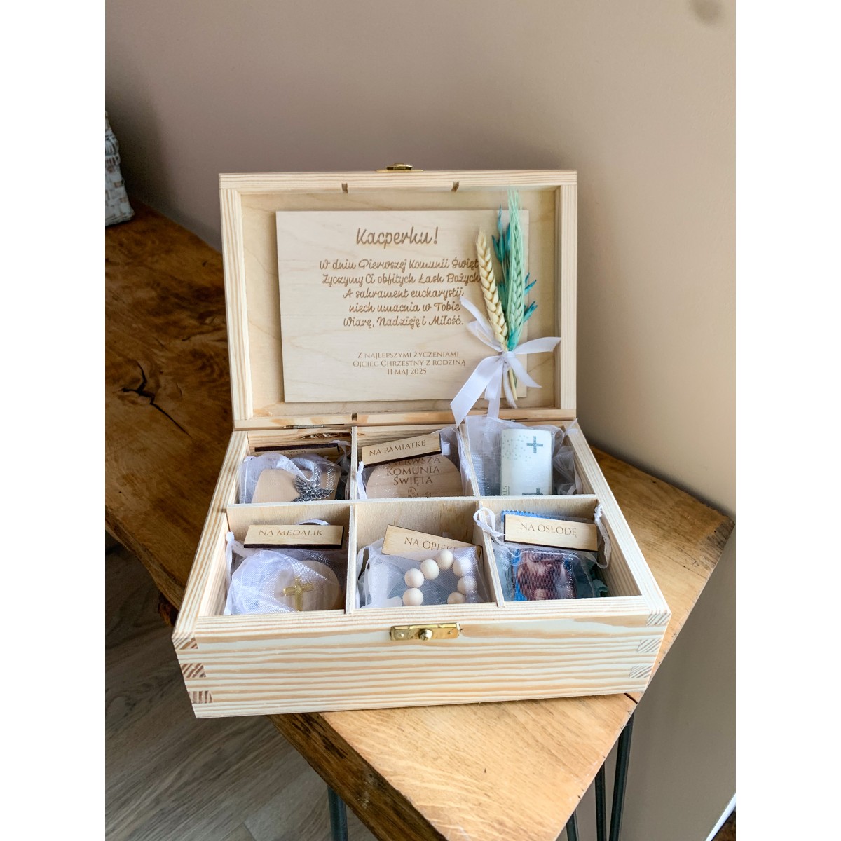 Pamiątka Pierwszej Komunii, personalizowane pudełko z przedmiotami